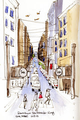This sketch is "Turk Street" in San Francisco. I love these city canyons with the tall buildings and perspective. I captured the building outlines and general perspective in about 5 minuts then added the details and color later in the hotel room.